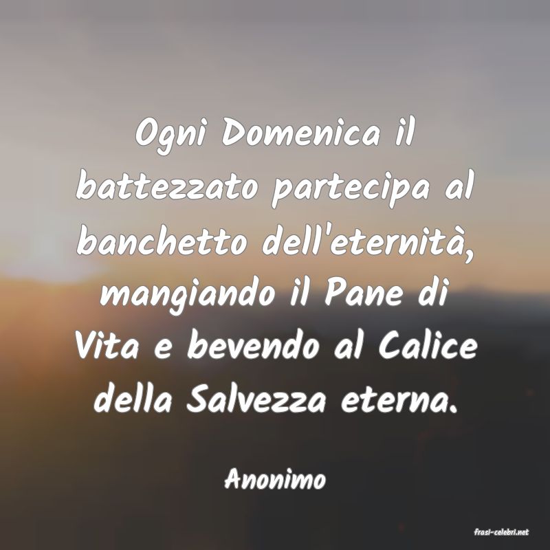 Ogni Domenica il battezzato partecipa al banchetto dell'eternità, mangiando il Pane di Vita e bevendo al Calice della Salvezza eterna.