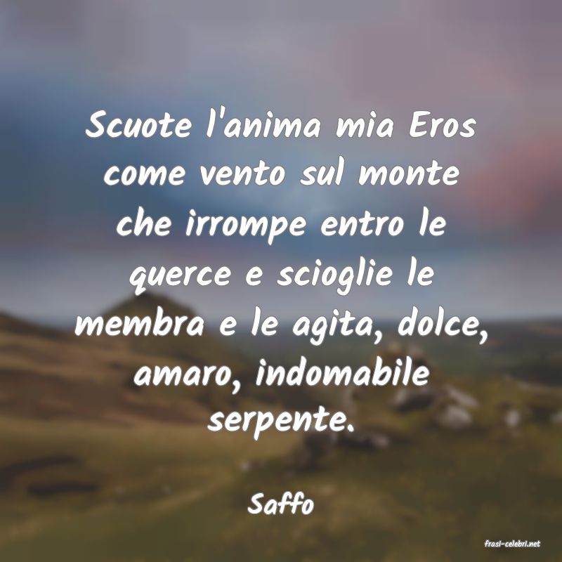 Scuote l'anima mia Eros come vento sul monte che irrompe entro le querce e scioglie le membra e le agita, dolce, amaro, indomabile serpente.